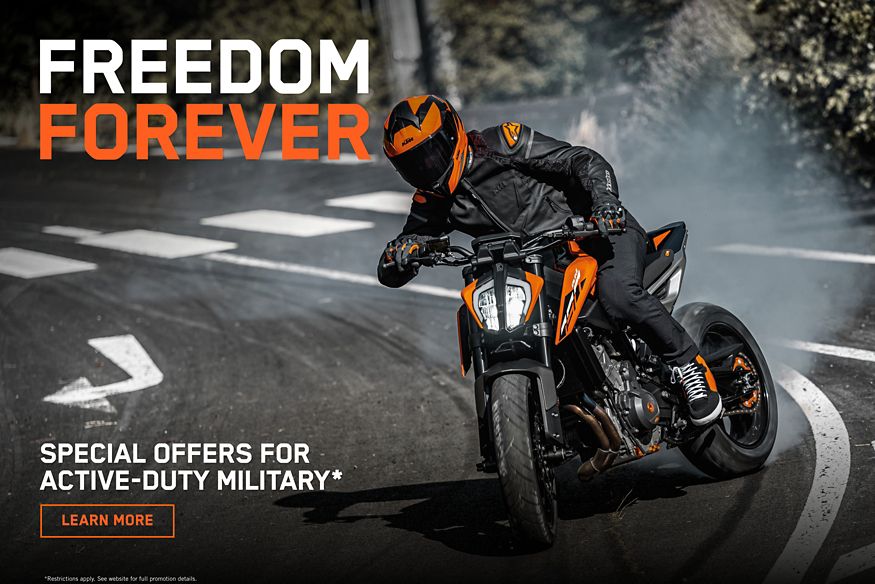 Terms & Conditions:* The FREEDOM FOREVER: MILITARY LOAN PROGRAM is for active-duty military serving in the Army, Navy, Air Force, Marines and Coast Guard, and applies to select new, unregistered KTM motorcycles only. Offers subject to credit approval by FreedomRoad Financial (FRF), a loan production center of Evergreen Bank Group, Member FDIC. Offers subject to model availability and dealer participation. Finance and program offer cannot be combined with any other promotional offerings. Valid from January 1, 2024 through December 31, 2025. Military loan program special offer is only valid through authorized KTM dealers. Please see your authorized KTM dealer for all program details.